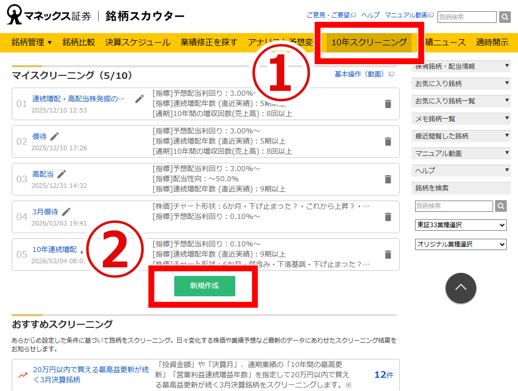 画面上部のメニューから①10年スクリーニングを選択し、次に②新規作成ボタンをクリックしてください。ここが銘柄発掘のスタート地点です。
