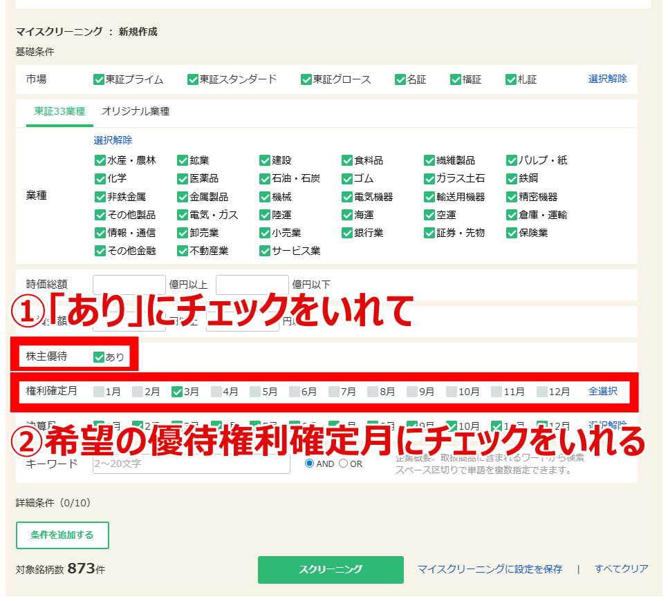 - 株主優待: ①ありにチェックを入れます。