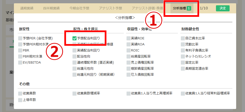 まず、①分析指標タブを選択し、その中にある②予想配当利回りにチェックを入れます。