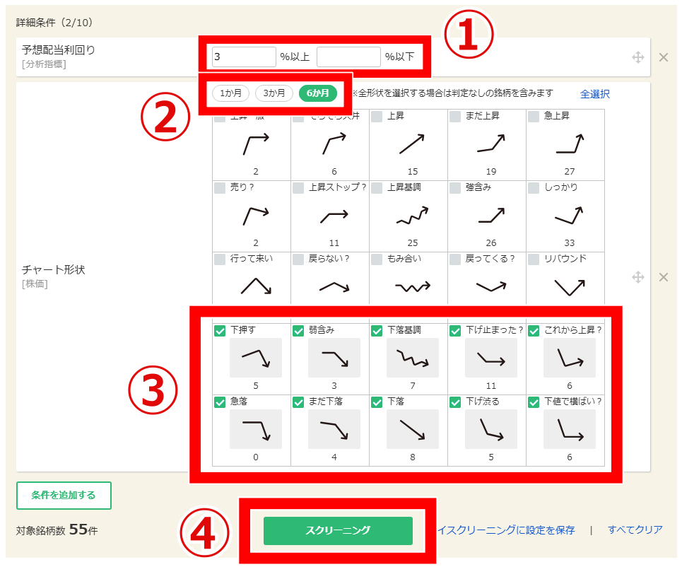 ■ ステップ3:詳細条件(配当利回り・チャート形状)を追加する