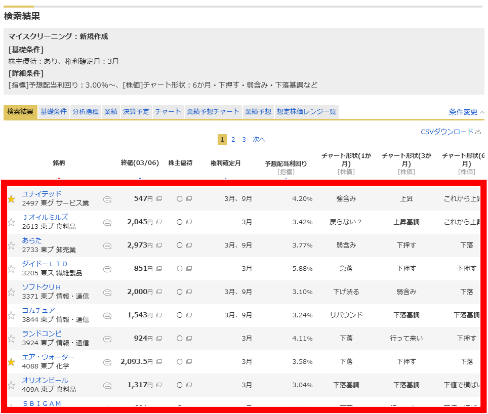 これで、見事に「優待あり×高配当(3%以上)×チャートが底値圏(6か月)」の銘柄リストが、一瞬で抽出されます。