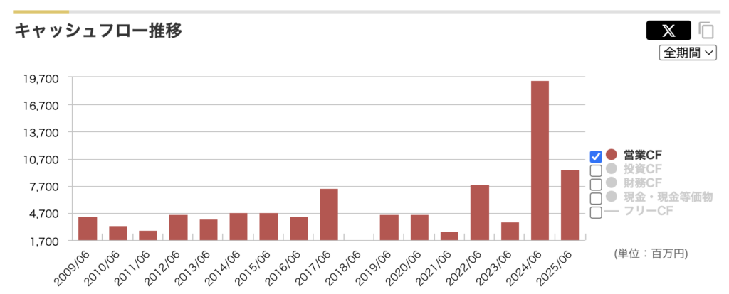 銘柄スカウターなら、個別銘柄のページから「企業分析」タブ → 「キャッシュフロー推移」の「営業CF」タブを開くだけで、過去10年分の現金の出入りが視覚的なグラフで一目でわかります。