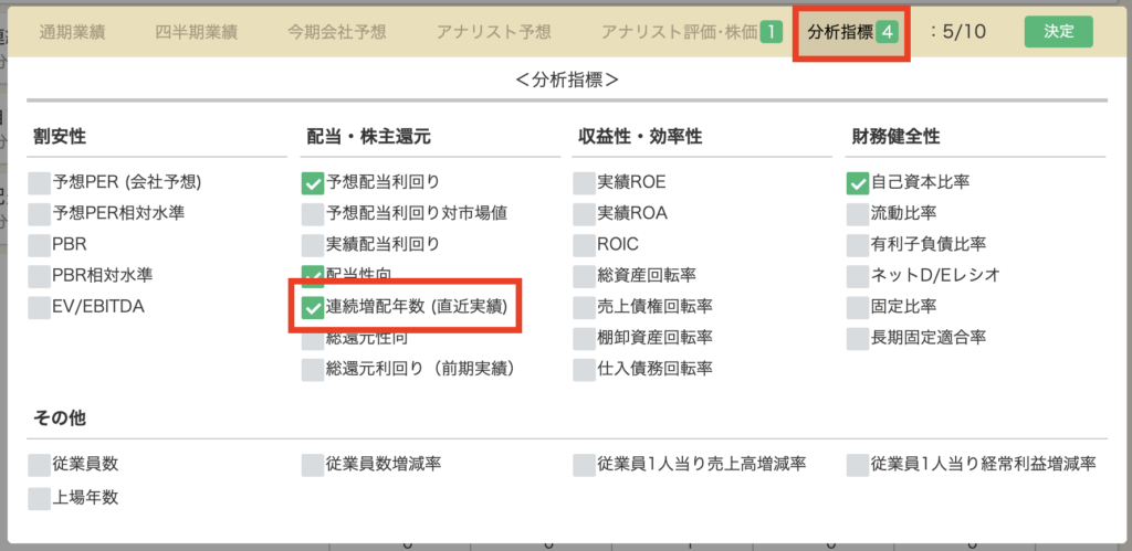 配当利回りやチャート形状以外にも、高配当株投資家に取って重要な「連続増配年数」を条件に加えることも可能です。