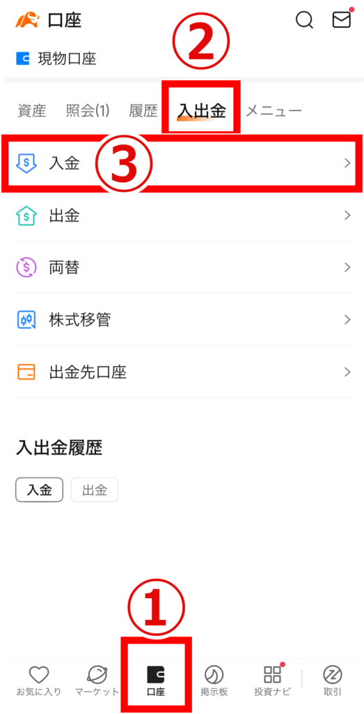 ①アプリ下の「口座」タブ > ②「入出金」 > ③「入金」をタップ。