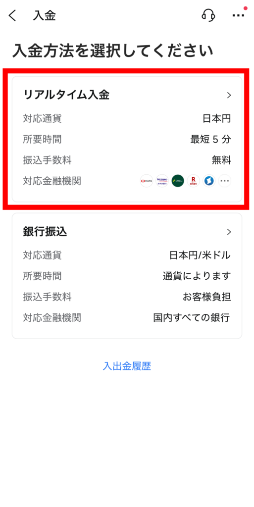 おすすめは「リアルタイム入金」。手数料無料で即時反映されます。