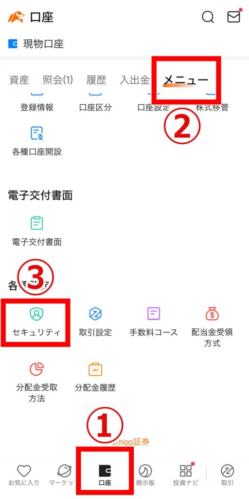 ①口座 > ②メニュー >③セキュリティ の順でタップします。