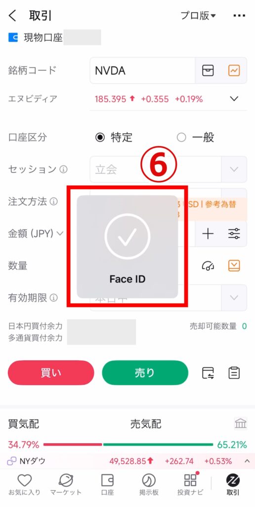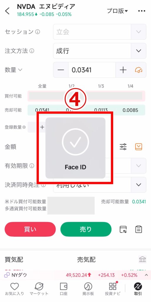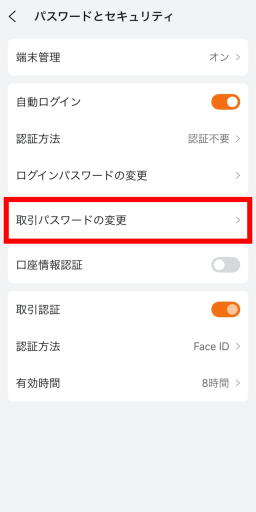 ⑥顔認証か取引パスワードによる注文解除を行います。