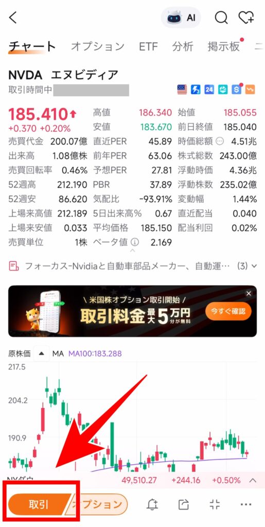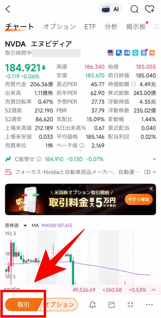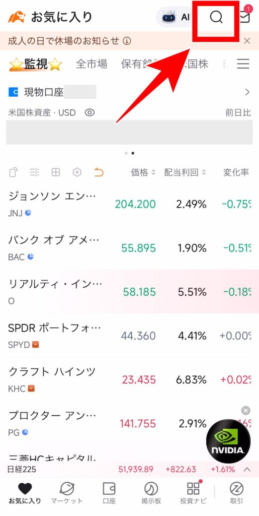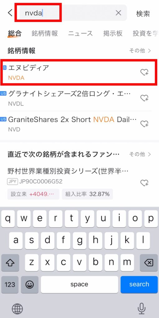 検索窓で「NVDA」や銘柄名で検索し、詳細ページへ。