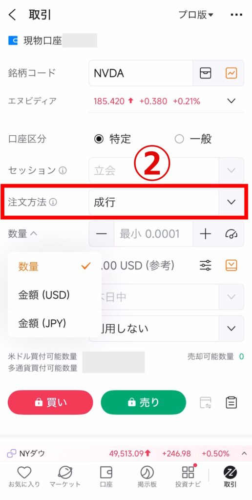 ②注文方法は、今回は例として、即時で株が買える「成行」を指定します。