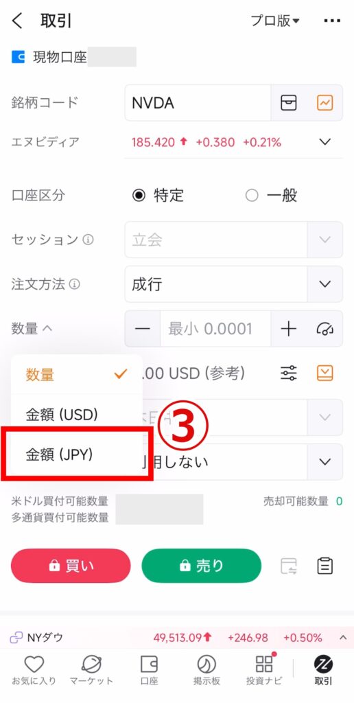 ③今回は「1000円分」の株を購入してみるため、「金額(JPY)」を選択します。