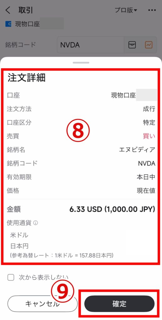 ⑧注文内容に間違いがないか確認して⑨「確定」をタップ