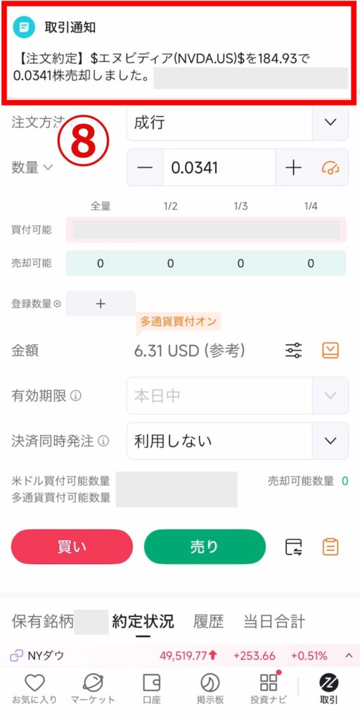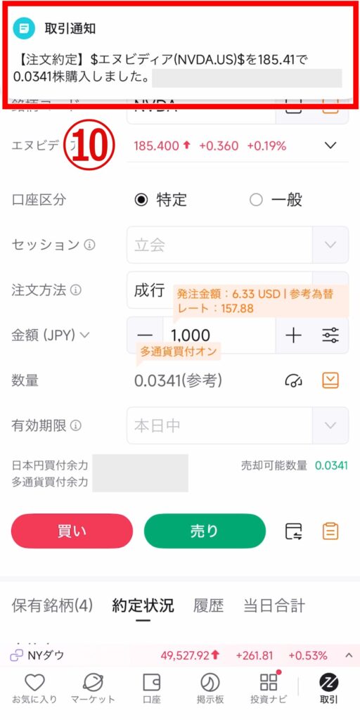 ⑩今回は「成行」注文だったため、キャプチャのように即時で買付が完了します。