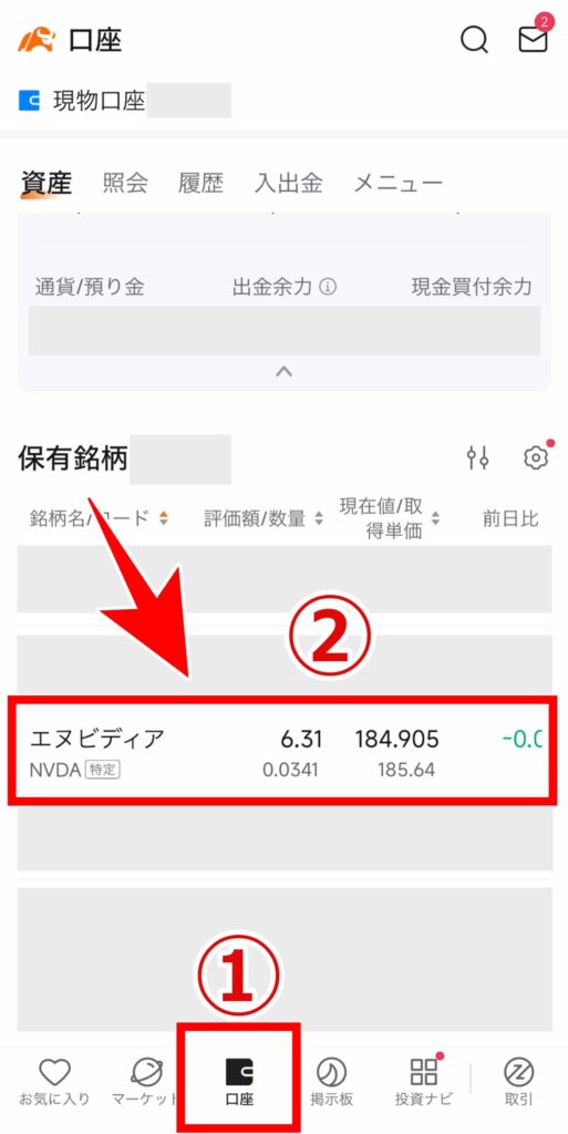 ①口座 > ②保有銘柄リストから対象銘柄をタップ