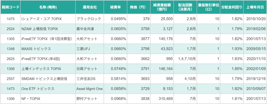 続いて、ETF(上場投資信託)を見ていきましょう。 主要なTOPIX連動の東証ETF一覧がこちらです。