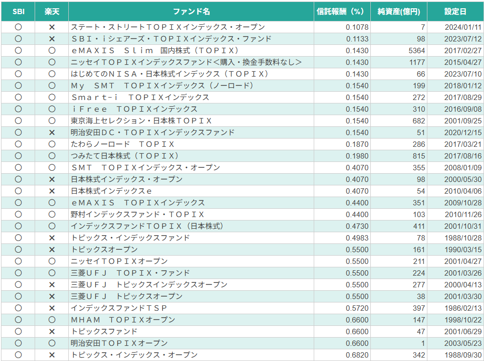 そこで今回は、SBI証券と楽天証券で取り扱いのある主要な「TOPIX連動型」商品をすべてリスト化し、徹底比較しました。