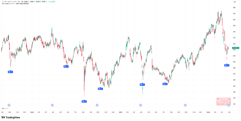 ただ、株価チャートでRSIと株価チャートを照らし合わせながら見るのも面倒なので、株価チャートにRSIが30を割ったタイミングで「買い?」マークを表示させています。