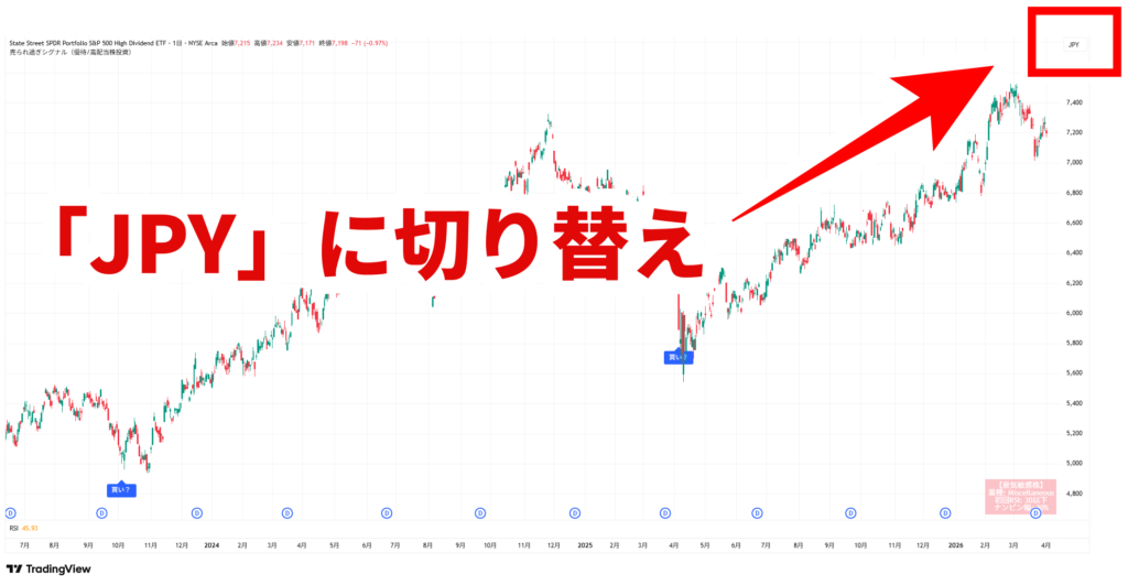 米国株の場合は画面右上から通貨を切り替えられるので「JPY」を選択することで円建てチャートが確認できます。